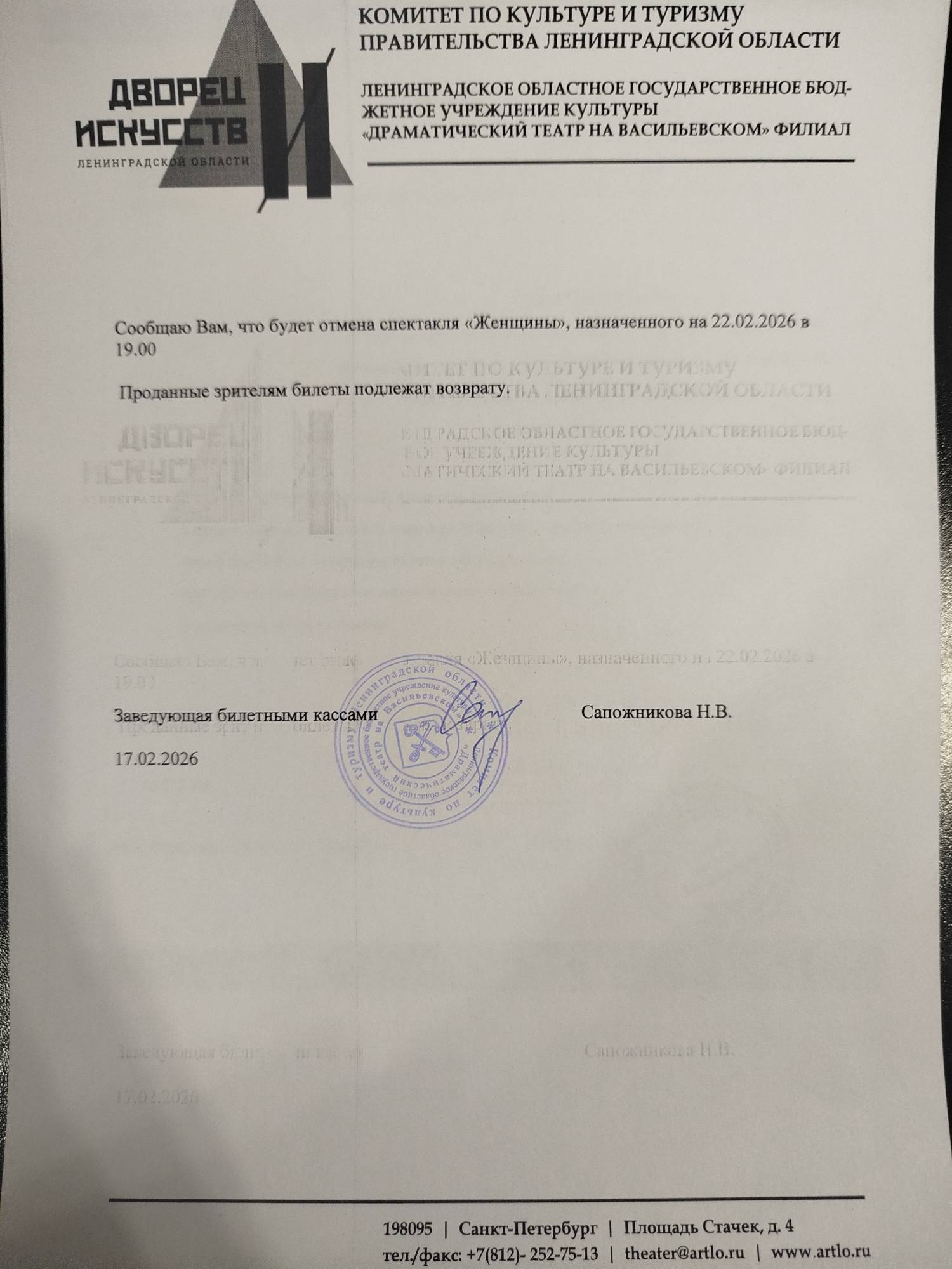 Уважаемый клиент! Спешим сообщить, что по информации, полученной от организатора, спектакль «Женщины», запланированный на 22 февраля 2026 года в 19:00 в во Дворце Искусств Ленинградской области, отменён. Деньги за электронные билеты вернутся автоматически в полном объёме на карту, с которой была произведена оплата. Если вы купили билет в кассе Ticketland.ru за наличный расчет, то обратитесь, пожалуйста, на почту: vozvrat@ticketland.ru. С уважением, команда поддержки Ticketland.