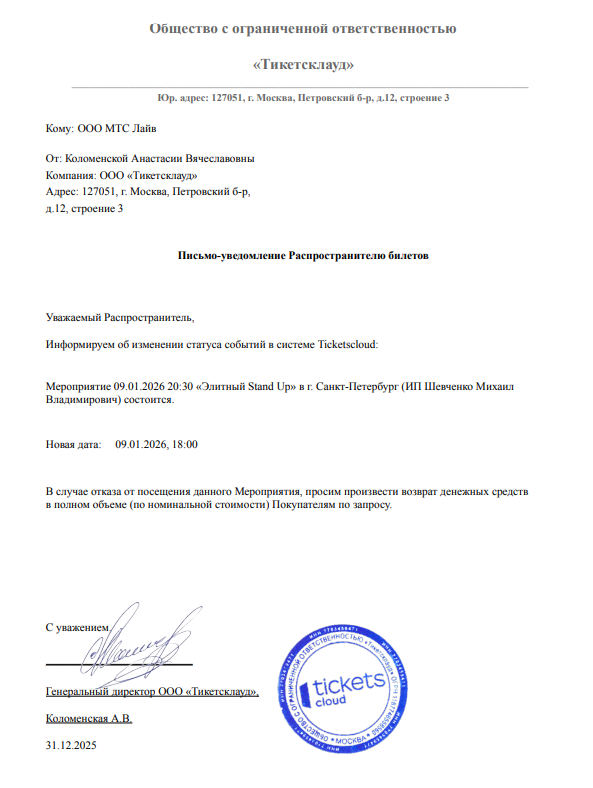 Уважаемый клиент! Спешим сообщить, что по информации, полученной от организатора, экскурсия «Вечерняя экскурсия по Петербургу», запланированная на 31 декабря 2025 года в 17:30, отменена. Деньги за электронные билеты вернутся автоматически в полном объёме на карту, с которой была произведена оплата. Если вы купили билет в кассе Ticketland.ru за наличный расчет, то обратитесь, пожалуйста, на почту: vozvrat@ticketland.ru. С уважением, команда поддержки Ticketland.