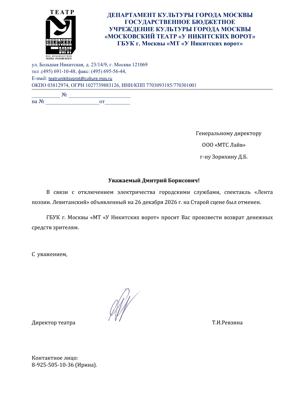 Уважаемый клиент! Спешим сообщить, что по информации, полученной от организатора, спектакль «Приключения Коли и Миши», запланированный на 10 января 2026 года в 12:00 в ГДК «Зеленогорск», отменён. Деньги за электронные билеты вернутся автоматически в полном объёме на карту, с которой была произведена оплата. Если вы купили билет в кассе Ticketland.ru за наличный расчет, то обратитесь, пожалуйста, на почту: vozvrat@ticketland.ru. С уважением, команда поддержки Ticketland.