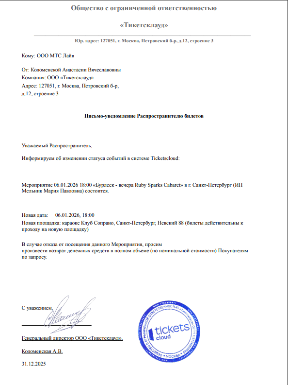 Уважаемый клиент! Спешим сообщить, что по информации, полученной от организатора, шоу «Бурлеск. Вечера Ruby Sparks Cabaret», запланированное на 06.01.2026 в 18:00 в ресторане «Квартира 8», состоится на новой площадке: караоке Клуб Сопрано, Санкт-Петербург, Невский 88 Ранее приобретенные билеты действительны, обменивать их не нужно. Если новые условия вас не устраивают, вы можете вернуть билет по кнопке в личном кабинете во вкладке «Заказы». Деньги за электронные билеты вернутся автоматически в полном объёме на карту, с которой была произведена оплата. Если вы купили билет в кассе Ticketland.ru за наличный расчет, то обратитесь, пожалуйста, на почту: vozvrat@ticketland.ru. С уважением, команда поддержки Ticketland.