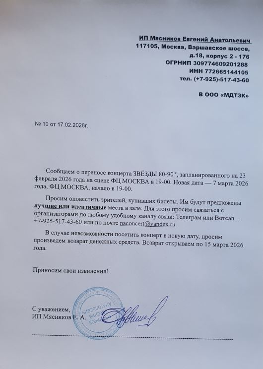 Уважаемый клиент! Спешим сообщить, что по информации, полученной от организатора, концерт «Звёзды 80-90-х», запланированный на 23 февраля 2026 года в 19:00 в «ФЦ Москва», перенесён на 7 марта 2026 года, начало в 19:00 Ранее приобретенные билеты действительны, обменивать их не нужно. Если вам не удобно посетить мероприятие, вы можете вернуть билет по кнопке в личном кабинете во вкладке «Заказы». Деньги за электронные билеты вернутся автоматически в полном объёме на карту, с которой была произведена оплата. Если вы купили билет в кассе Ticketland.ru за наличный расчет, то обратитесь, пожалуйста, на почту: vozvrat@ticketland.ru. С уважением, команда поддержки Ticketland.