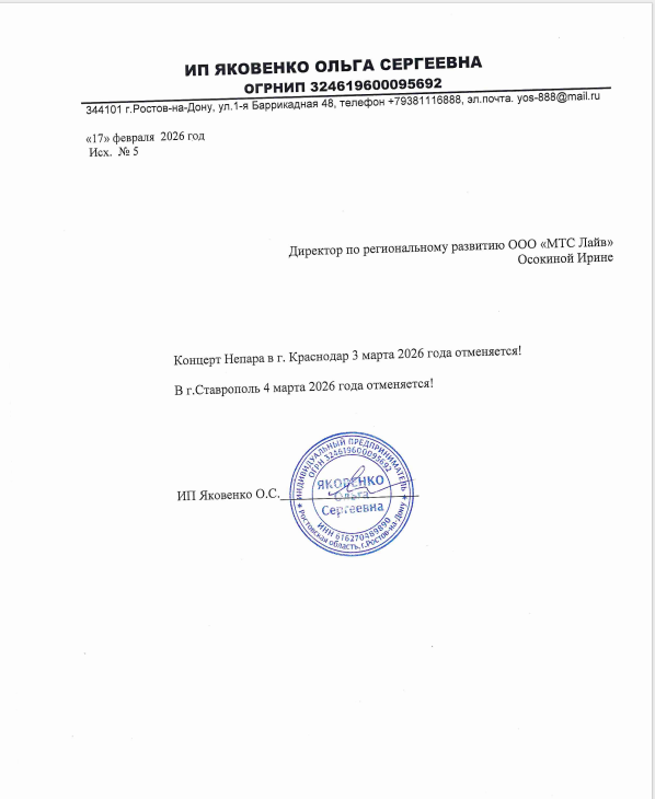 Уважаемый клиент! Спешим сообщить, что по информации, полученной от организатора, концерт Александра Шоуа и группы «Непара», запланированный на 2026-03-04 в 19:00 в Ставропольском Дворце культуры и спорта, отменён. Деньги за электронные билеты вернутся автоматически в полном объёме на карту, с которой была произведена оплата. Если вы купили билет в кассе Ticketland.ru за наличный расчет, то обратитесь, пожалуйста, на почту: vozvrat@ticketland.ru. С уважением, команда поддержки Ticketland.
